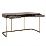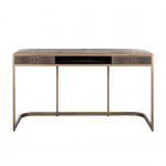 Eleganckie biurko idealne do gabinetu. Biurko charakteryzuje się precyzyjnym wykończeniem z teksturowanej sztucznej skóry shagreen oraz złotymi metalowymi elementami. Dzięki biurku wprowadzisz smak elegancji do swojego wnętrza. Biurko posiada 2 zamykane szuflady oraz 1 otwartą półkę, przez co pomieści dużo niezbędnych rzeczy. Brązowa skóra i złote metalowe akcenty to czysty styl Glamour! Idealnie sprawdzi się w biurze i gabinecie.