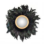 Okrągłe, złote lustro wiszące ścienne z czarnymi piórami.