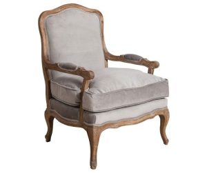 Fotel klasyczny w welurowej, szarej tapicerce. Idealnie wkomponuje się w stylowe wnętrza. Gięta rama i ozdobne nogi wykonane są z dębu szczotkowanego.  Wypełnienie stanowi pianka poliuretanowa + pierze.