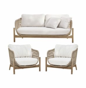 Ten zestaw mebli jest doskonały na taras lub do ogrodu. Dwa fotele i sofa – wygodny stelaż z aluminium został opleciony miękkim pokryciem linowym, a następnie stylowo i solidnie osadzony na nogach z drewna akacjowego. W komplecie poduszki ze zdejmowanymi, nadającymi się do prania, odpornymi na promieniowanie UV i wytrzymałymi pokrowcami. Dzięki temu nowoczesnemu zestawowi wypoczynkowemu – składającemu się z sofy i dwóch foteli – możesz przekształcić swój taras w przytulny salon na świeżym powietrzu. Ten stylowy design charakteryzuje solidna rama z drewna akacjowego, ale też oparcie z aluminium i wytrzymałe pokrycie z miękkiej, cętkowanej siatki z tworzywa sztucznego. Oczywiście nie można nie wspomnieć o tapicerowanych poduszkach na siedziska i oparcia, które sprawiają, że meble są tak przytulne i wygodne. Wysokiej jakości zestaw wypoczynkowy o ponadczasowej elegancji i lekkości.