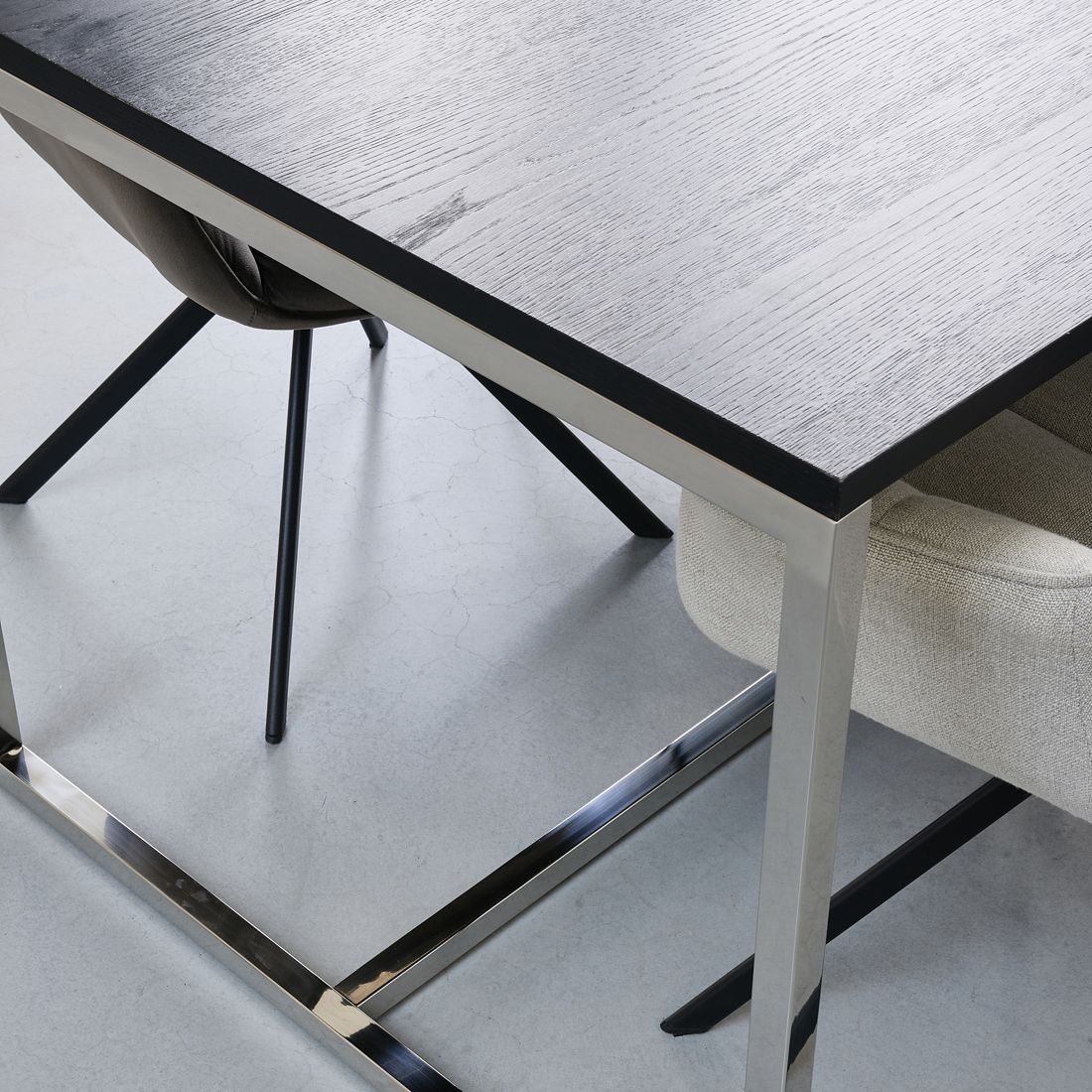 Stół Nomad jest prostokątny. Blat wykonany jest z drewna dębowego i jesionowego. Stół posiada solidną podstawę ze stali nierdzewnej.