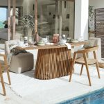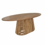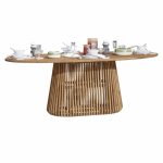 Stół z czterech nóg i blatu? To już historia! Obecnie ekskluzywne modele designerskie podbijają nawet sektor outdoorowy. Zamiast czterech nóg stół ten ma stożkową podstawę w kształcie kolumny, która została wykonana z niezliczonych smukłych rozpórek z drewna. Tę ekstrawagancką podstawę uzupełniono obszernym blatem, na którym szlachetne drewno tekowe może pokazać piękno swojego charakterystycznego usłojenia. A ponieważ użyte tu drewno pochodzi z odzysku, jego usłojenie jest szczególnie wyraziste. Drewno tekowe jest również doświadczonym profesjonalistą w zakresie zastosowań zewnętrznych, ponieważ może wytrzymać wiatr i warunki pogodowe, a zatem jest idealnie przystosowane do ciągłego użytkowania na patio. Owalny kształt jest również nietypowy. Ten stół łączy w sobie komunikacyjne zalety okrągłego stołu z możliwością dodania do niego dodatkowego krzesła, dzięki czemu może przy nim usiąść 8-10 osób.