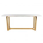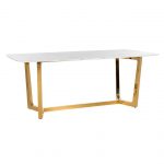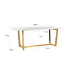 Stół Marmur to ponadczasowa elegancja z nutą nowoczesności. Do zrobienia blatu użyto mocnego i trwałego konglomeratu imitującego marmur Carrara. To świetna alternatywa dla klasycznego marmuru, bardzo czułego na wszelkie czynniki zewnętrzne i uszkodzenia mechaniczne. Dzięki temu stół sprawdzi się zarówno w pokoju dziennym, jak również w kuchni czy w jadalni. Tak niebanalne wzornictwo w połączeniu z odcieniami złota doda smaku każdemu wnętrzu. Stół Marmur to bardzo funkcjonalny, trwały i wytworny mebel. Blat z konglomeratu imitującego marmur opiera się na solidnej podstawie ze stali nierdzewnej w kolorze błyszczącego złota. Nogi zostały wzmocnione stopkami, które chronią powierzchnię podłogi przed zarysowaniem. Waga: 250 kg