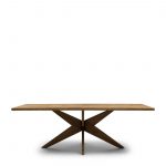 Stół do jadalni Portland. Prostokątny, drewniany stół do jadalni. Blat stołu składa się z inkrustowanego dębu z odzysku w węgierskim punkcie. Drewno jest bardzo zróżnicowane pod względem tonacji kolorystycznej i faktury. Skrzyżowana podstawa tego stołu do jadalni jest również wykonana z litego dębu. Stół do jadalni Portland dostępny jest również w wersji okrągłej.