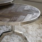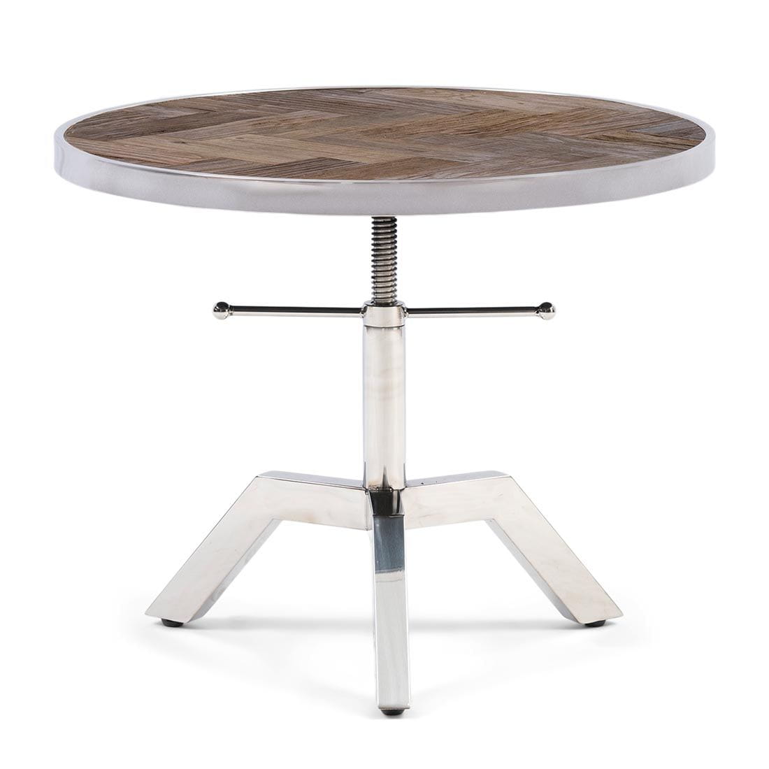 Wysokość tego stolika można regulować w zakresie od 40 do 50 centymetrów. Aby uzyskać efektowny efekt, umieść wiele stołów obok siebie na różnych wysokościach. Blat wykonany jest z wiązu pochodzącego z odzysku, które Riviera Maison pozyskuje np. ze starych drzwi. Dzięki temu faktura blatu jest zawsze inna, oryginalna. Blat stołu ma wzór w jodełkę i ozdobne obramowanie ze stali nierdzewnej.