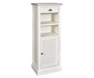 Korpus mebla w kolorze antycznej bieli stanowi drewno akacjowe obite płytą MDF. Płyta jest umieszczona również na tylnej części mebla. Dolna część mebla posiada żaluzjowe drzwiczki tzw. shuttersy nawiązujące do stylu nadmorskich wnętrz w Hamptons. Charakter mebla podkreślają delikatne przetarcia na drzwiczkach.