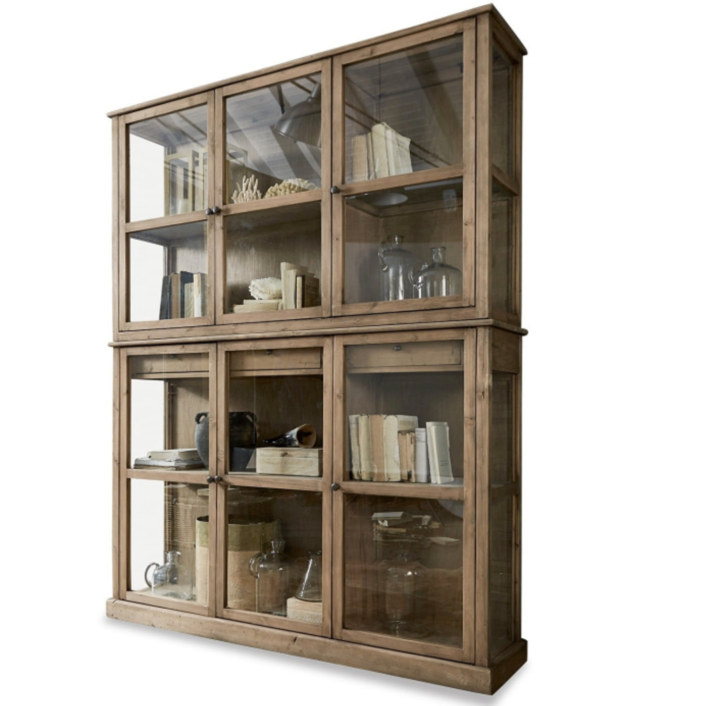 Solidny mebel w stylu rustykalnym. Drewno jodłowe z odzysku jest naturalne i delikatnie barwione, dzięki czemu udało się ukazać jego piękno w pełnej krasie. Dostęp do wnętrza szafy zapewnia sześcioro drzwi, a cztery półki tworzą dodatkową przestrzeń. Piękne połączenie szkła i drewna.