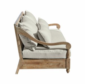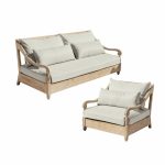 Zestaw zawierający fotel i sofę przemienia taras w śródziemnomorską oazę. Przepiękne i odporne na warunki atmosferyczne drewno tekowe o subtelnie bielonym wykończeniu. Miękkie poduszki mają wodoodporne pokrowce i szybkoschnące wypełnienie. Arcydzieło tradycyjnego rzemiosła stanowi prawdziwą gratkę dla miłośników wyszukanych dodatków. Niewiele współczesnych mebli zasługuje na takie wyróżnienie, ale ten zestaw mebli – zdecydowanie tak. Prawdziwy stolarski kunszt przejawia się w misternie zdobionym oparciu, elegancko wygiętych podłokietnikach i delikatnie toczonych nóżkach. Zachwyca również samo drewno – zestaw mebli wykonano z wytrzymałego drewna tekowego, które dzięki subtelnemu bieleniu dumnie eksponuje swoje piękne i wyraziste usłojenie. Drewno tekowe to najlepszy wybór dla ekskluzywnych mebli ogrodowych, które mogą stać na tarasie przez całe lato. Bogato wyściełane i przyjemnie miękkie poduszki siedziska i oparcia nie tylko zapewniają niezrównany komfort, lecz mają także wytrzymałe poszycia, które nadają się do użytku na zewnątrz. Dzięki temu nie trzeba ich natychmiast chować, gdy na niebie pojawi się ciemna chmura. Niezwykle praktycznym rozwiązaniem jest również to, że poduszki siedziska są mocowane do stelaża za pomocą rzepów, co zapobiega ich przesuwaniu.